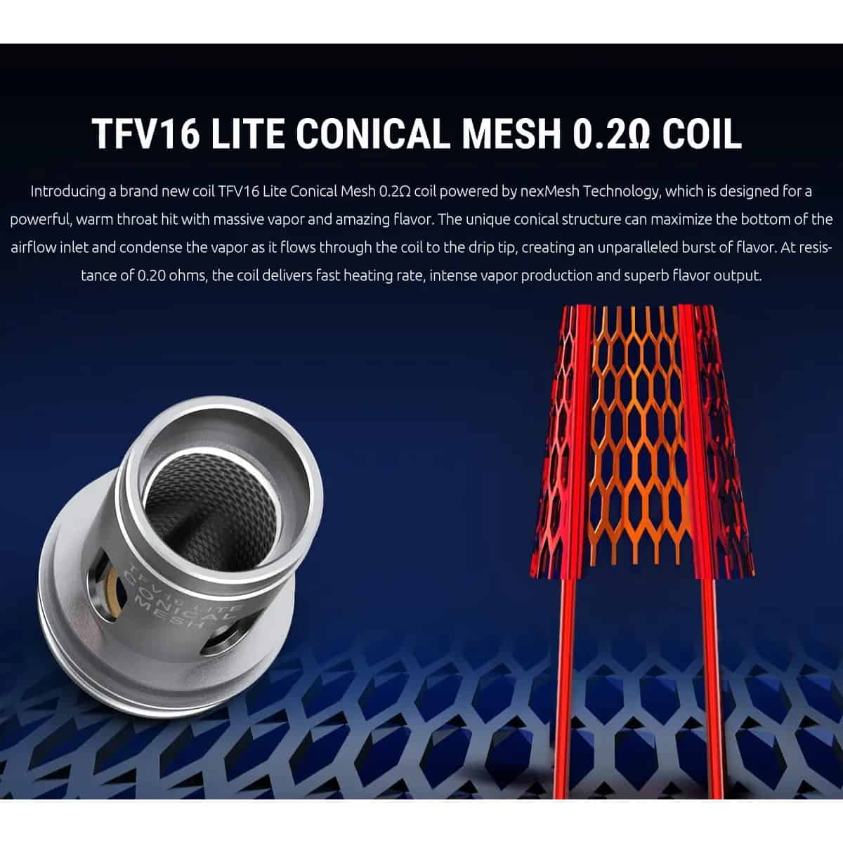 - TFV16 Lite Conical Mesh 0.2Ω Coil: This coil uses NexMesh technology to deliver a powerful and warm throat hit with outstanding flavor. Recommended usage is between 60 – 85 watts.