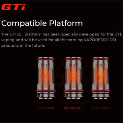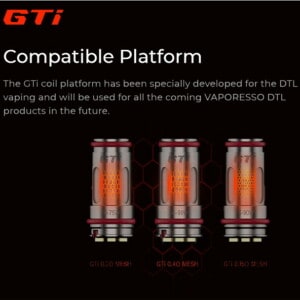 Vaporesso GTi Coils, compatible with multiple Vaporesso kits, offer varying resistances for DTL inhalation and enhanced flavor with mesh coils.