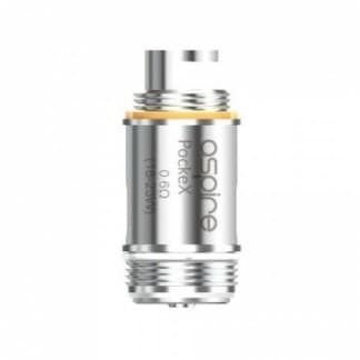 Available coil options include specific PockeX coils with 0.6 Ohm resistance (included) or a 1.2 Ohm option (sold separately), as well as Aspire Nautilus X series coils, offering everything from 0.7 Ohm mesh to higher resistances of 1.5 Ohm and 1.8 Ohm. A 60% or 70% VG e-liquid is recommended for the 0.6 Ohm coil, while higher PG liquids are best used with other coil resistances.