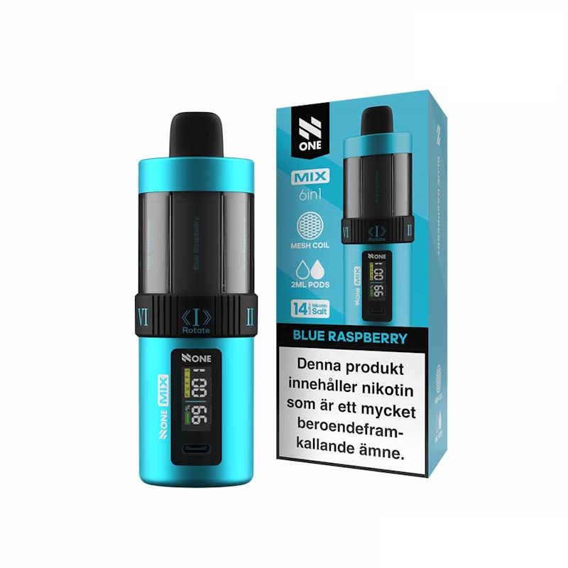 N One 6 in 1 Mesh Kit – Blue Raspberry is a pod device featuring a blue raspberry flavor, with 14 mg nic salt and a rotating pod system. The rechargeable 1100mAh battery charges via USB-C, and the display shows battery status and puff count. Pods can be replaced when empty.
