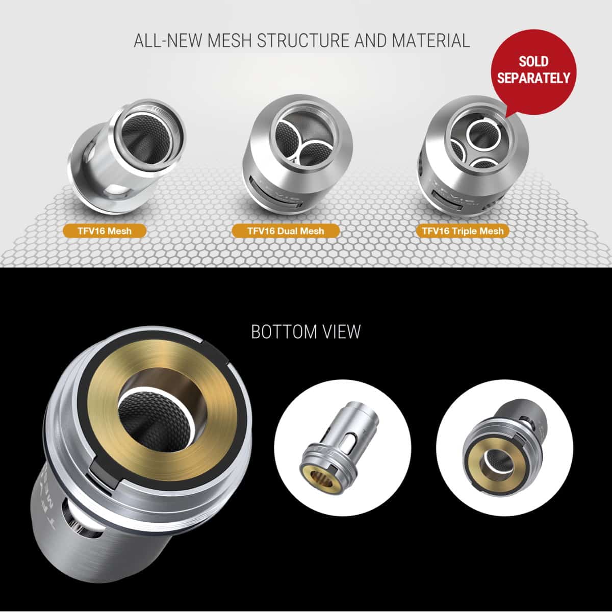 TFV16 takes over the throne among Smok’s atomizers. This is a tank which gives enormous clouds but requests that the user can take really big puffs. The new Mesh coils with honeycomb structure is made specially for TFV16 and comes in 3 versions where the 2 included is run best at around 120W.