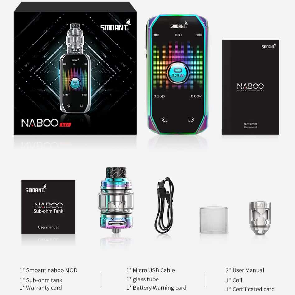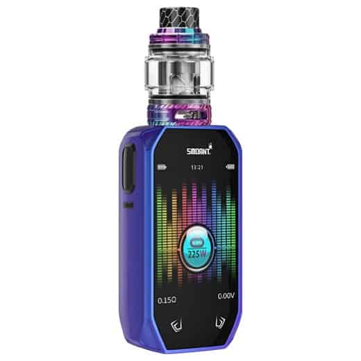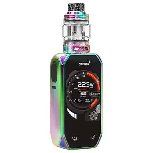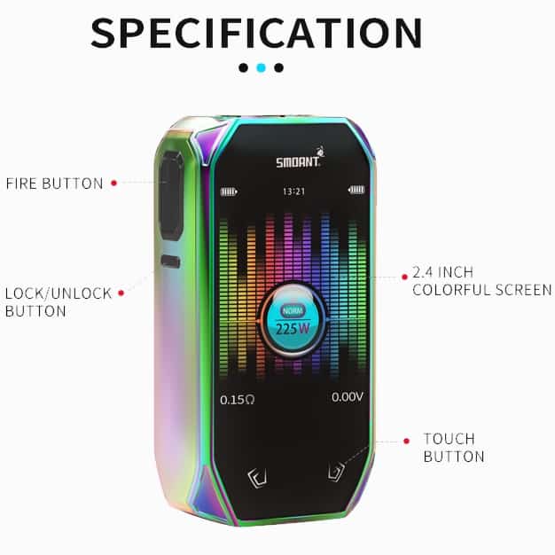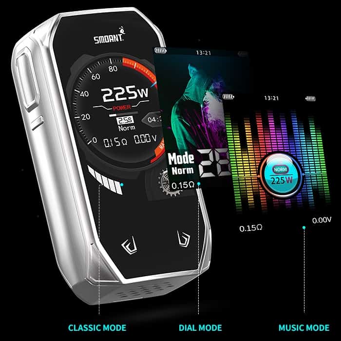 Smoant Naboo 225W Mod is compact in size with an ergonomic design, with 2.4 inch colorful touchscreen with DIY wallpaper feature, which can give you a clearer and more detailed visual experience with custom wallpaper, if you do not want to upload your own image There are a number of wallpapers to choose from. Powered by double 18650 batteries (not included), Naboo MOD has a maximum output of 225W with TC mode. The new Ant225 chip gives Naboo an activation time of just 0.015 s. The new music mode makes the screen respond visually to your voice or when music is playing. The fire button is located on the side and directly below it is the screen saver. In addition, it uses Vibration-enable buttons with tactile feedback.